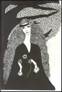 这张画其实画得并不好,但买这本画册就为她。第一眼看到她,就被她的眼神打动,里面是一种义无返顾的消沉。微微张开的嘴不太含蓄,若闭拢会更好;手指画得不自然,但透着病态的软弱,也够了。我喜欢那繁复的树叶,黑色伸延的枝干,瀑布飞泻般的卷曲长发,还有那掩盖一切的黑衣。