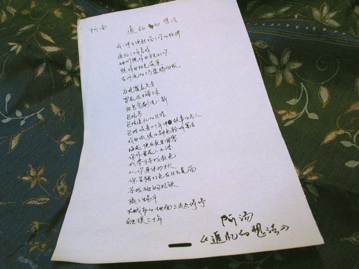 我还是想不起来为什么买这瓶墨。估计我这篇写完也想不起来,或者某天半夜我突然从床上翻起来大笑——想起来了。真神经病个。 阿汤当年写这些诗的时候有没有想过用背景颜色或者图片来衬?当时可能只想着白纸黑字了,或者压根儿想的跟这没关系。如果写诗的人都想着自己出来的东西会衬什么样子的底,那么这诗还能写好么?回头给合伯宝剑看看,他是写诗的一人。不过估计我问他这问题,他得吐血。 阿汤、阿波、阿九,说实话我一向搞不清,也没想搞清楚,反正我也不认得。我会想到他们就想到: 让美丽的在一边美丽。我们向沉默者沉默。这句话什么意思我一点没在乎,就是这么念叨,很满意,很舒服,很就是那个意思,就我现在这个意思,这个样子,这个不想跟你做任何解释的状态。 让美丽的在一边美丽。我们向沉默者沉默。 文字和音乐一样,还有绘画,写者和看者听者永远是两端,可能并排站在画前,可能面对共低着头听音,可能他写了你看了他是他你是你,老死不相往来。可就有那么一点线挂着,一根线的两端,忽悠忽悠地,两根手指捻着线头。 我总是不能释怀,这句话跟我说沉浸过往是两回事。我就是不能释怀,一些语句,一些乐段,一个画里飘忽的色块,我终其一生在追寻这些东西,象在风中追寻那根羽毛的鸟,或者大雨中硕大叶子下冷得发抖的大拇指。 原谅我很突然地提到大拇指同志。因为最近在看安徒生。有两句一定要记下来给你看,我用纸头掖好了记号: 当他们两人死后各躺在教堂一边的时候,他们坟上的菩提树就伸到教堂顶上去,把它们盛开的花朵交织在一起。 还有一句:从前有一个名副其实的学生:他住在一间顶楼里,什么也没有;同时有一个名副其实的小商人,住在第一层楼上,拥有整幢房子。 本来这两句我留好了都准备各自发挥一篇的,但今天这墨弄得我,把三个元素都用到了一个豆腐干里,真浪费。 不过还是要说一下,如果两个人虽然生前不能在一起,但死后它们的花能交织在一起——重要的是“交织在一起”——唉,你还要求什么? 就象这墨早已失去它初来的使命,但这么些年,它就守候着,每每应承着我突如其来的需要。而终于有这么一天,我用它写了一封信,和抄了一首诗。而因为在这个抄写的过程里,我重温了写字的快乐,重温了笔迹舒展的流畅,而由此我打开dreamweaver,来记录这又由此而来的文字的交叠。 那么你说它的使命是什么?是我已经忘了的买它的理由,还是今天这不经意的一个小时的过渡? 我不知道,我用这个来回答你: 让美丽的在一边美丽。我们向沉默者沉默。阿波会在一旁乐得嘿呲嘿呲地笑,因为我拿他的诗做了武器缴了时光的枪。我打落枪头和血吞,一派胡言向天歌。 好了好了,不胡扯了,再下去,我真不知道我会说出什么来写出什么来,看一看我写的字,沉默吧,我的孩子。 |