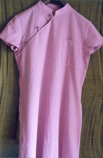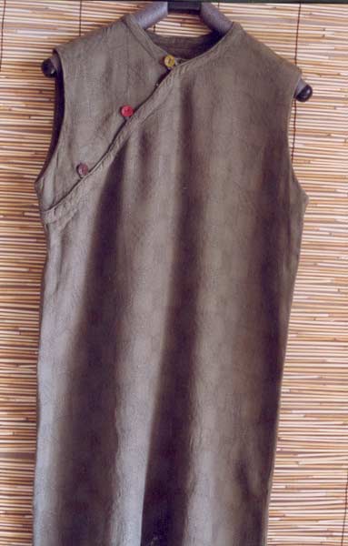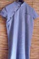 款式说明:宽松及膝连衣裙、无领、斜门襟