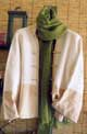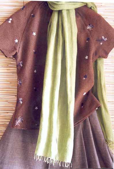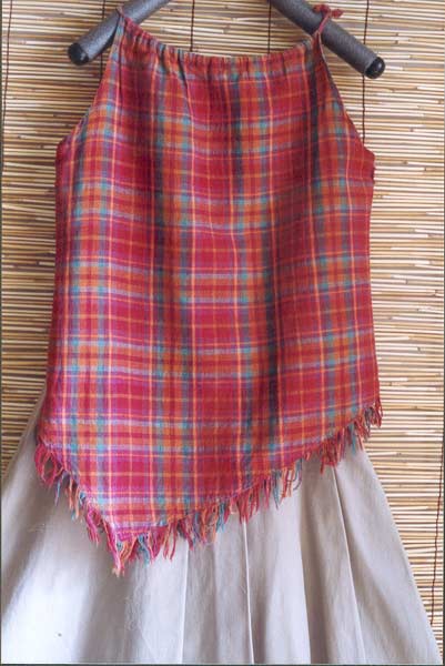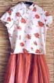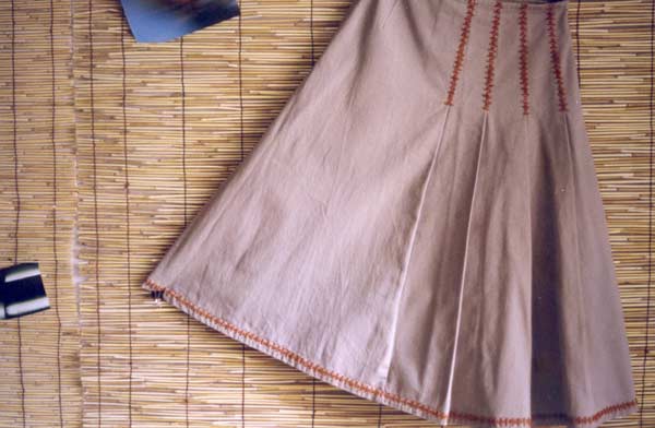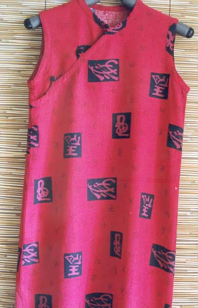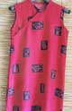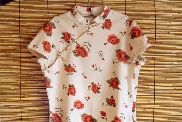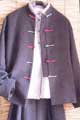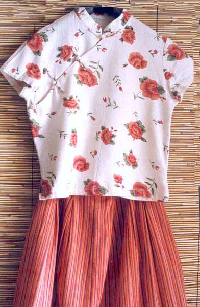款式说明:套装:衣,立领。袖口卷起,红绿相错老式扣子。裙子,前后片各三个大褶,裙边缘一圈红绿小花与衣服相映