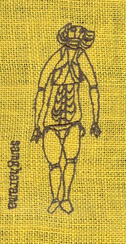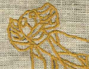 尺寸:30×18cm。明黄色镂空彩麻布上深灰绿色线绣。