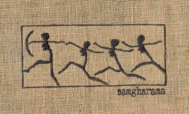 太平洋岛屿土著人岩画。本色镂空麻布上黑色线绣。