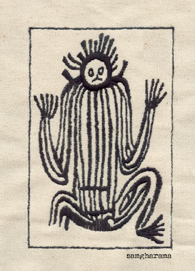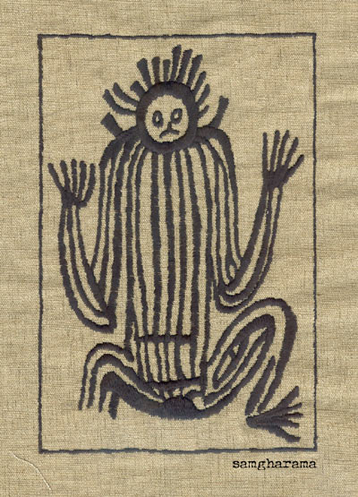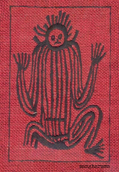 太平洋岛屿土著人图案,怪异深刻的造型。玫瑰红麻布上黑线绣。