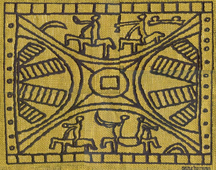 美洲版画。两架大风车旋转,农人耕作,其乐融融。黄绿色麻布上黑色线绣底。