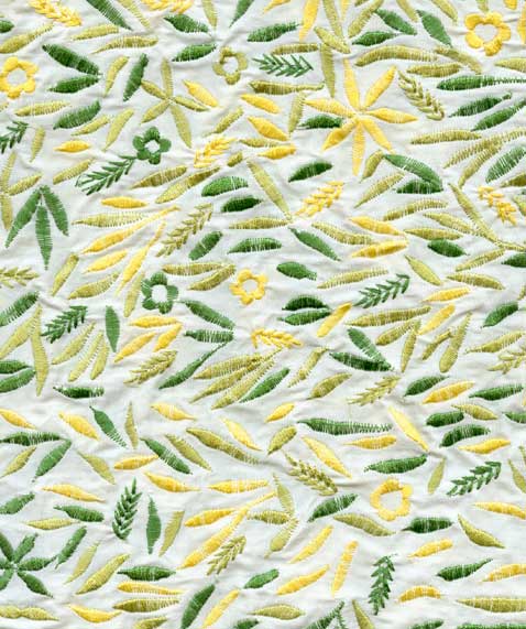 一个叫晓冬的女孩在绣花机上练手。我经过,看她的布上就用的金黄色的线绣了这些她自己创作的图案——惊叹!于是我找了一块大的布,配了这三种色,让她满绣。这就是她的作品,我取名“秋实”。