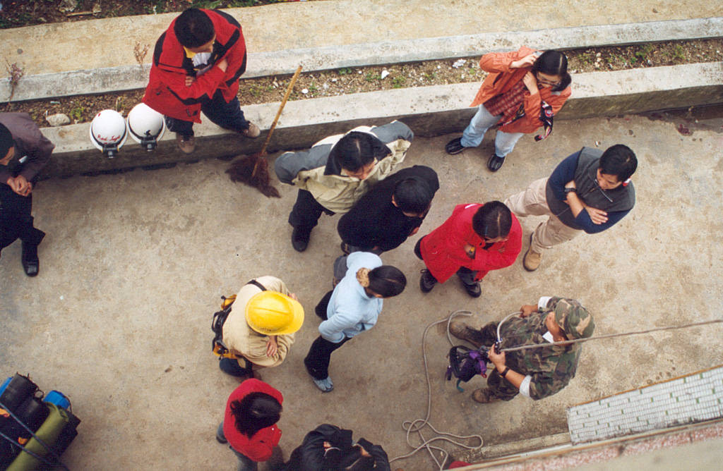| 队员们穿好SRT装备,准备下降。考虑到一号下降绳可能没有到地面,我们选择在体重上极有优势的包锐作为首发勇士。用红树林的话说就是,如果连他下去绳子还断不了的话,那其他人就肯定没有问题。当然,这是开玩笑,但真正可能存在的问题就是下降绳不够长,如果绳头离地超过三米,队员就有可能摔伤。选择体重较大的队员先下,有利于充分发挥下降绳百分之七的伸展性,在下降绳略显不够的情况下,他更有可能将绳子拉至地面。