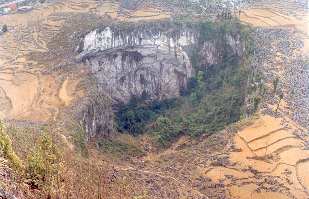 大巢天坑是非常典型的喀斯特漏斗,在谷底平坦之处突然凹陷。坑口成椭圆形,最宽不超过150米,最窄的地方只有不到100米,深约170米。从山头看下去,它就像是一口大井,坑内岩石的灰白和植被的墨绿相映相融,强烈的色差带来的感观刺激十分强烈。  |