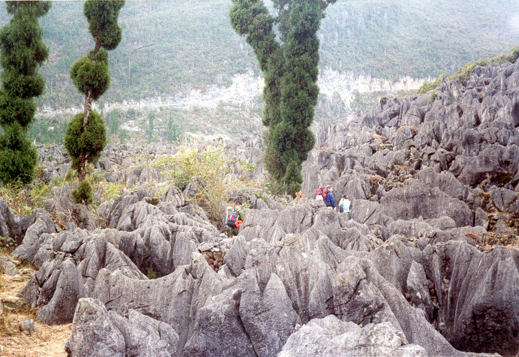 | 队员们前搀后扶到了谷底,在小石林中穿过,最后到达天坑口南边的一处绝壁前。红树林的先头部队早已到了,宋杰和赵忠军正忙着打点、挂绳,做下坑的准备。 |